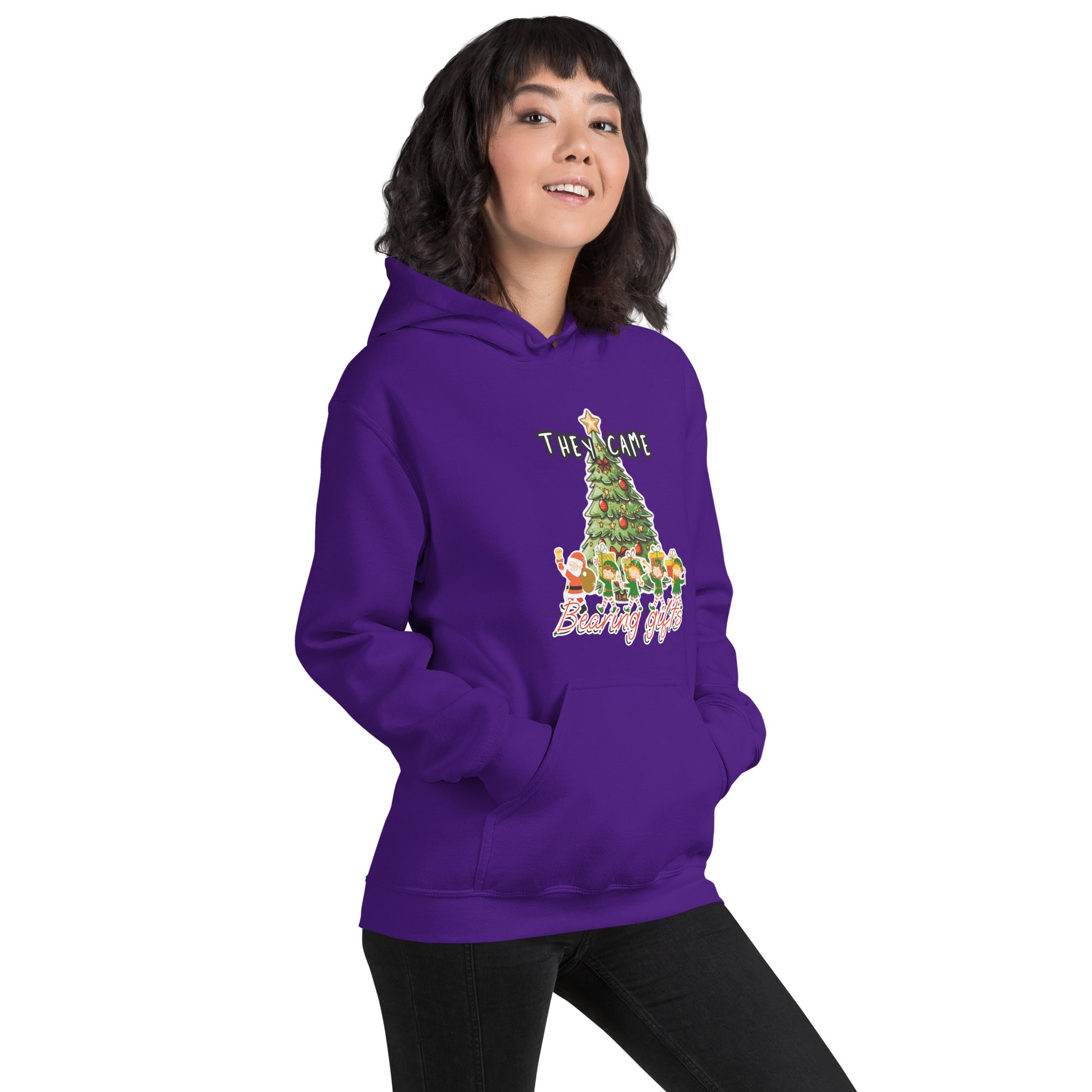 Celebrate the spirit of giving with the Bearing Gifts Hoodie; a cozy nod to the journey of the Magi and the essence of the season. Featuring elegant lettering that reads “They Came Bearing Gifts” accompanied by a subtle starburst or silhouette of the three wise men, this design captures the reverent joy of holiday tradition.